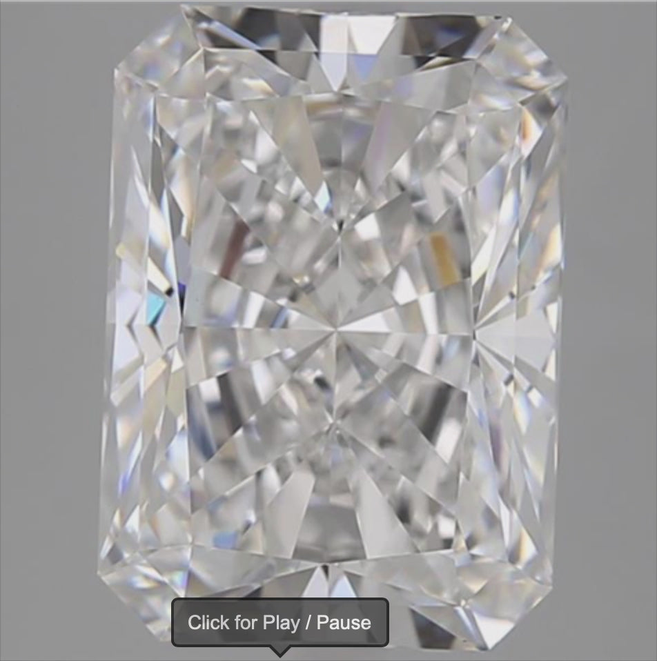 This 5.42-carat radiant-shaped lab-grown diamond has an E color, VS1 clarity, Excellent cut, and is certified by GIA.