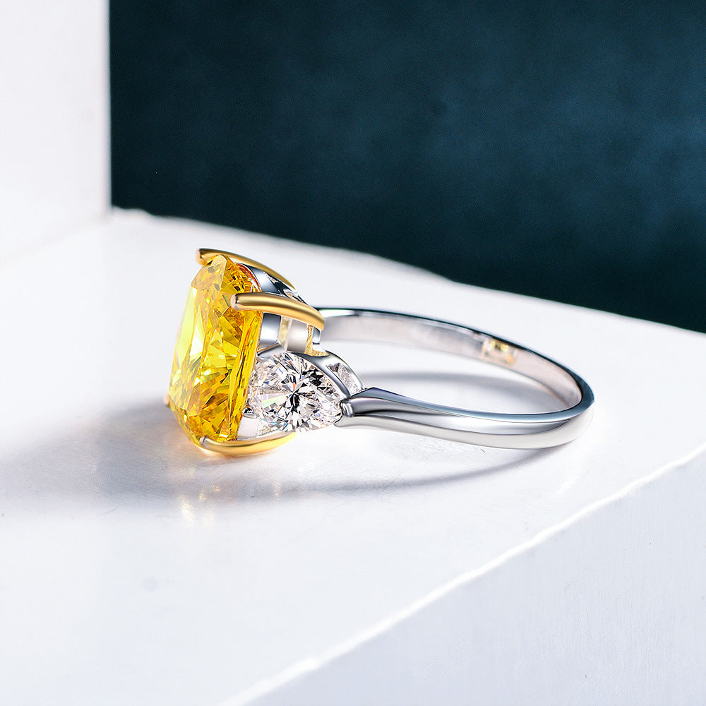 Indulge in the opulence of our Cushion on Pear Ring. Featuring a brilliant 6-carat vivid yellow lab-created diamond, this ring is a statement of luxury. The cushion cut center stone is accented by pear-cut side stone lab-created diamonds, adding a touch of sophistication and elegance. Elevate your style with this exquisite piece.