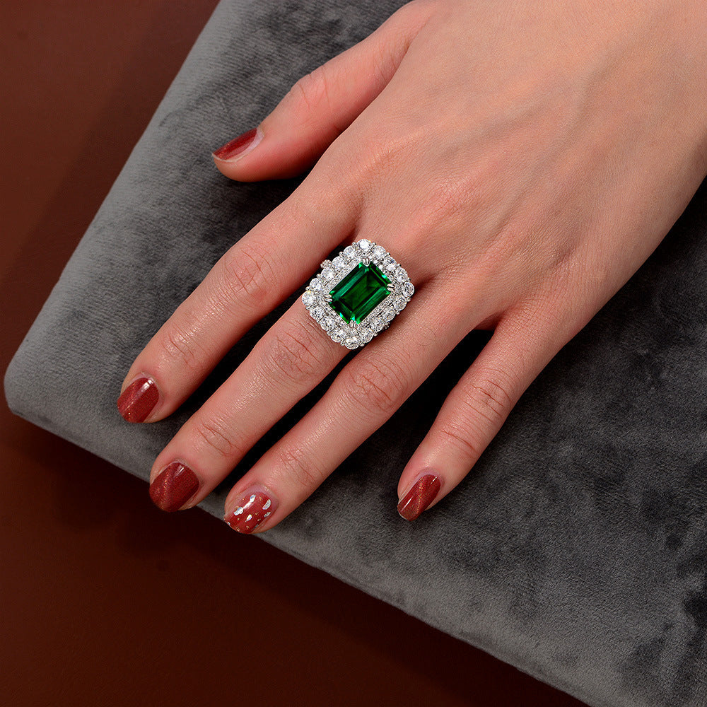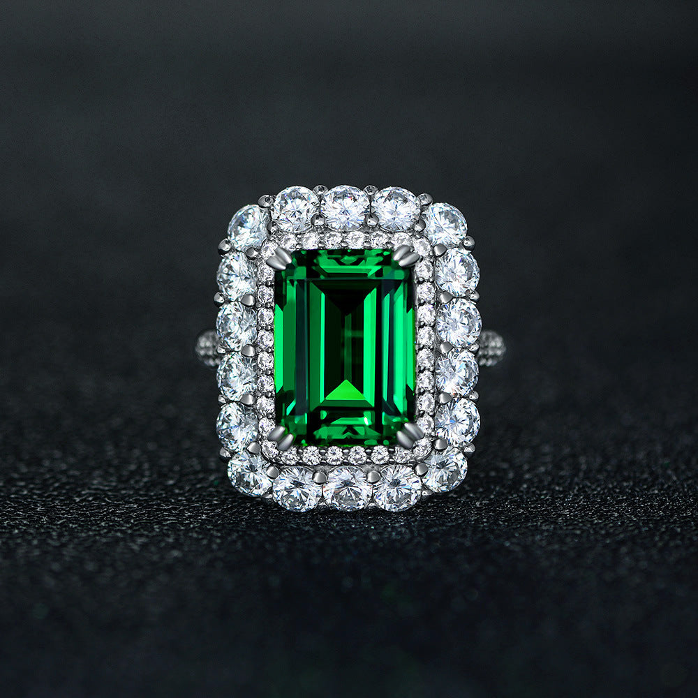 Gaze upon the exquisite beauty of our Emerald Eye Ring. This stunning piece features a vibrant lab-created emerald, surrounded by a double halo of sparkling lab-created diamonds. Crafted with unparalleled attention to detail, this ring exudes elegance and sophistication. Elevate your jewelry collection with this luxurious treasure.