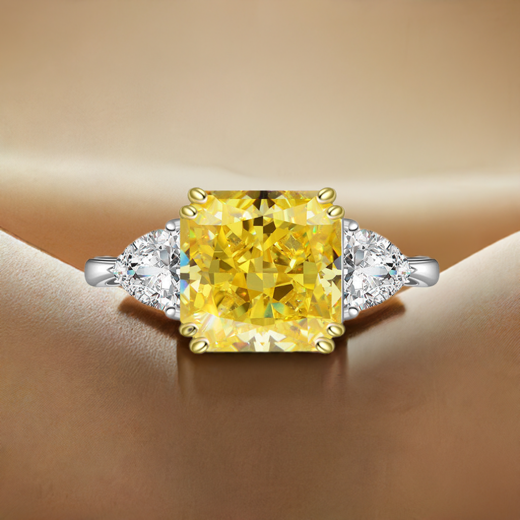 Indulge in sheer luxury with our Radiant on Trilliant diamond ring. Featuring a dazzling 7-carat lab-created radiant center yellow diamond, flanked by sparkling lab-created trilliant diamonds, this 3-stone ring exudes elegance and sophistication. Elevate any outfit with this exquisite piece of jewelry.