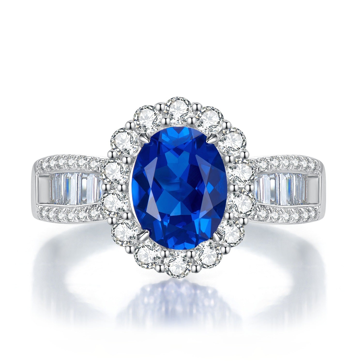 Indulge in the opulence of our Blue Sapphire Ring, featuring a stunning 2-carat lab-created sapphire surrounded by sparkling lab-created pavé and baguette diamonds. Channel your inner royalty with this luxurious piece, perfect for any special occasion. Elevate your jewelry collection with our exquisite ring.